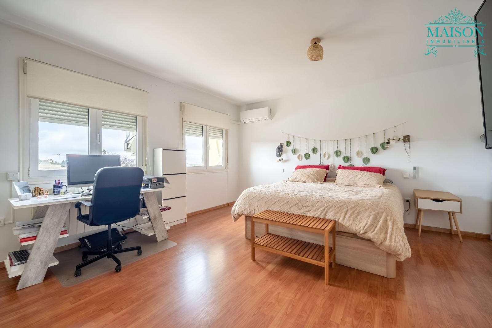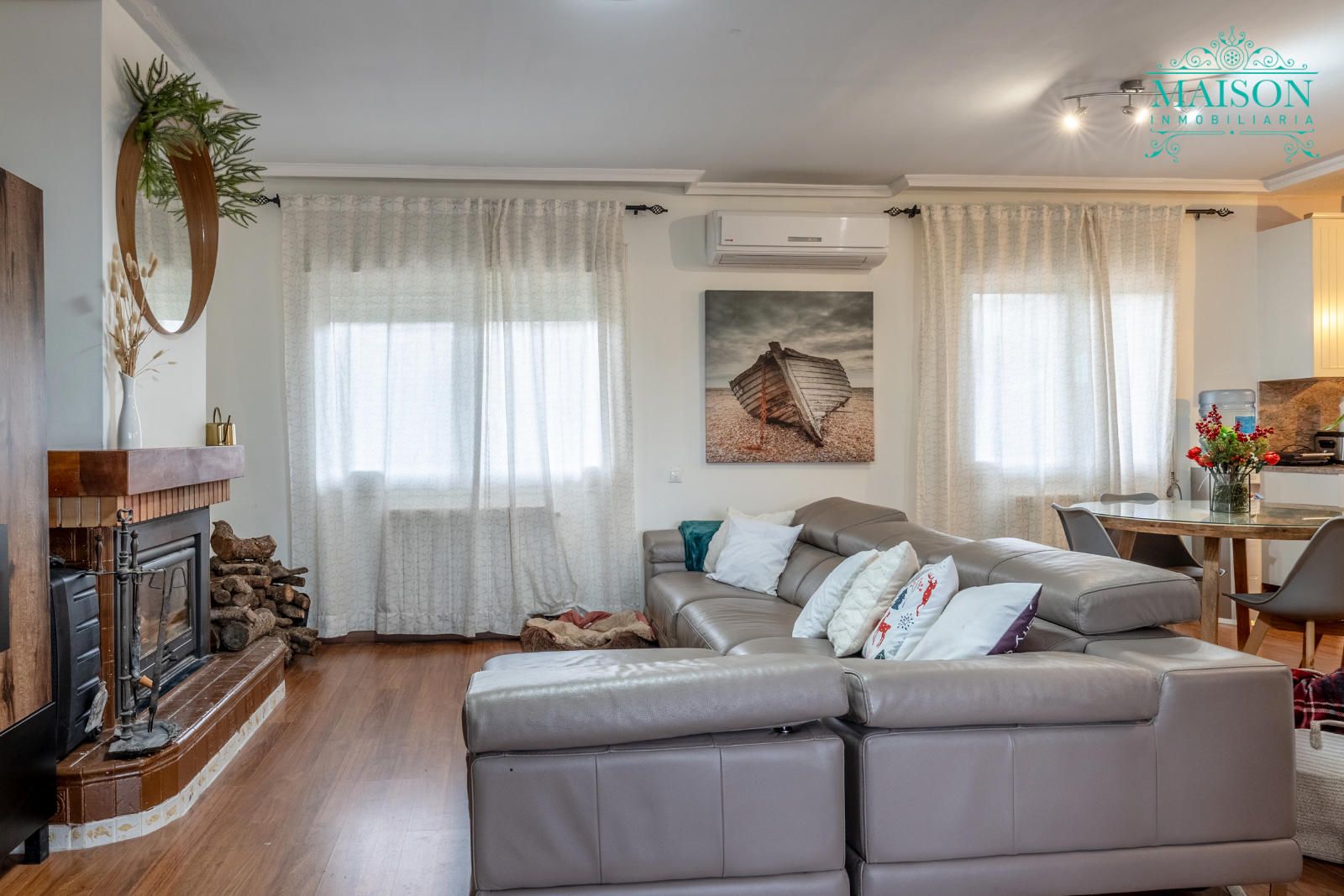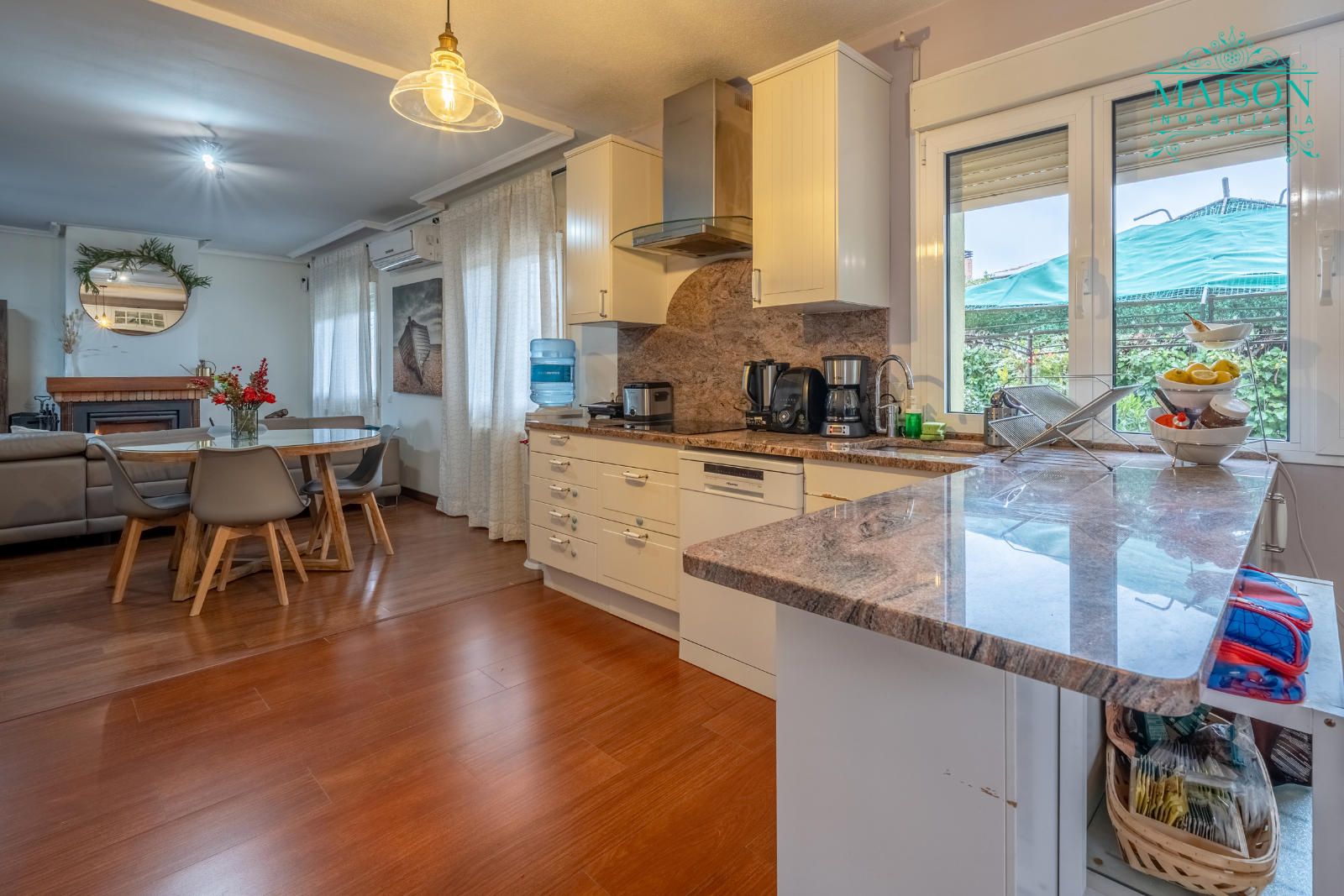Este chalet independiente tiene chimenea, aire acondicionado, armarios empotrados, puertas de madera lacadas en blanco, ventanas climalit oscilobatientes, suelos de tarima y gres, calefacción mediante propano, etc.