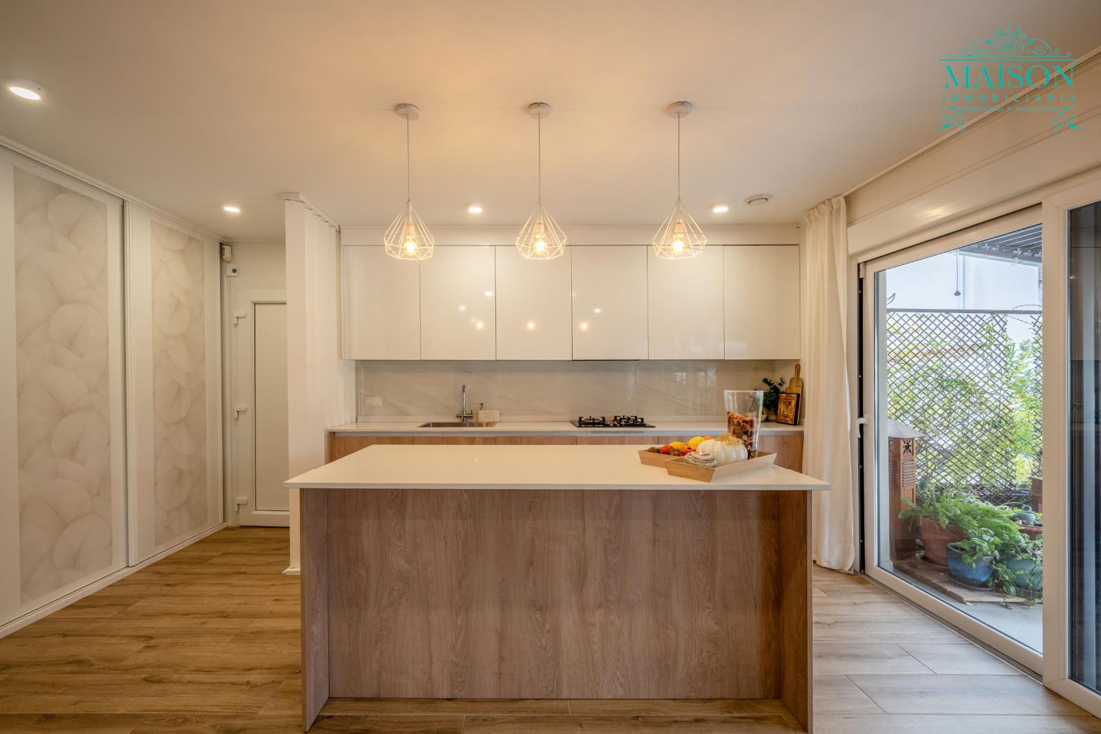 En la única planta principal ubicamos la cocina abierta al salón, con salida directa al porche, un baño, un despacho y tres dormitorios. Dos de los dormitorios cuentan con baño en suite.