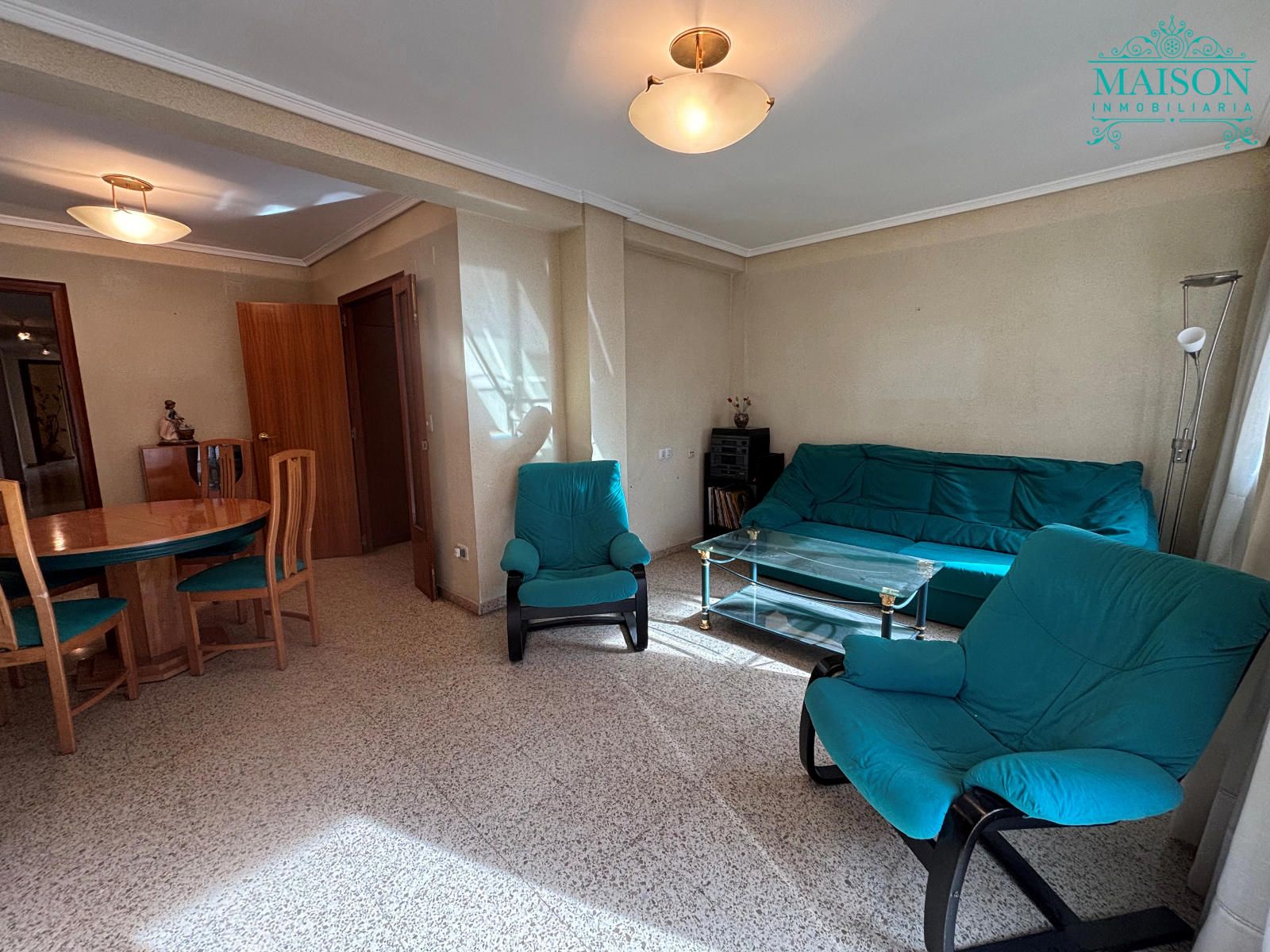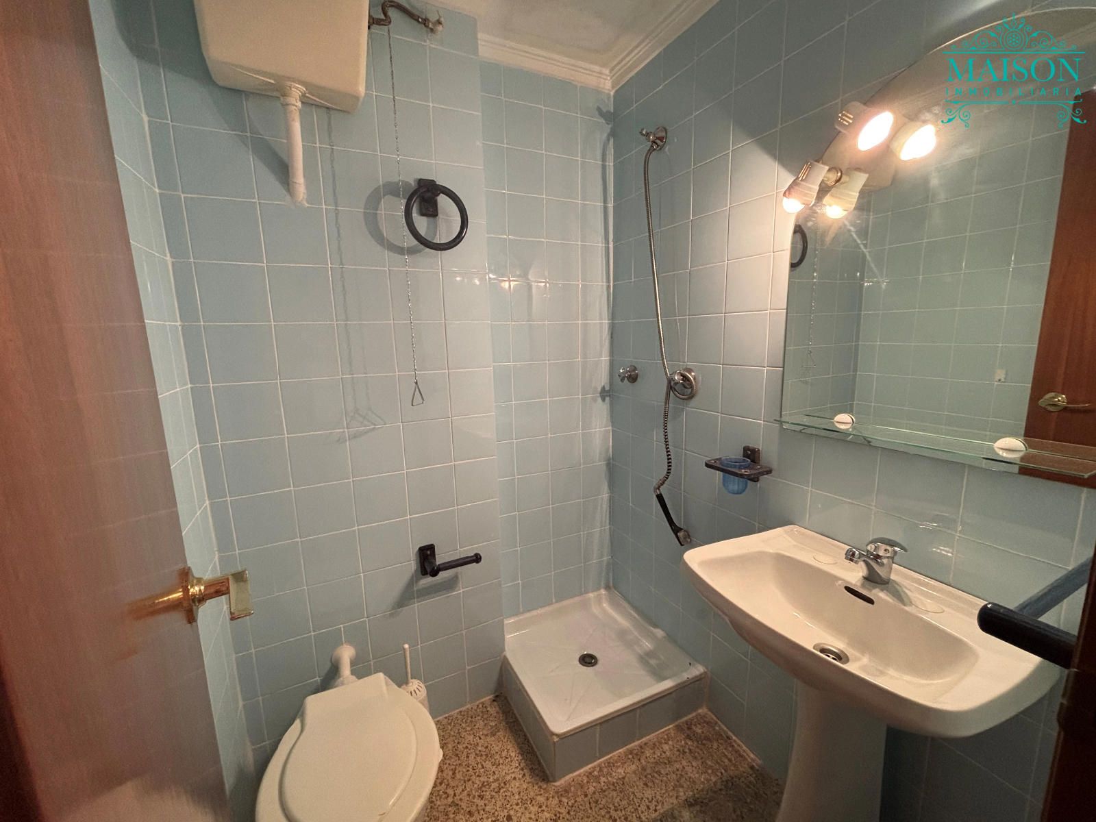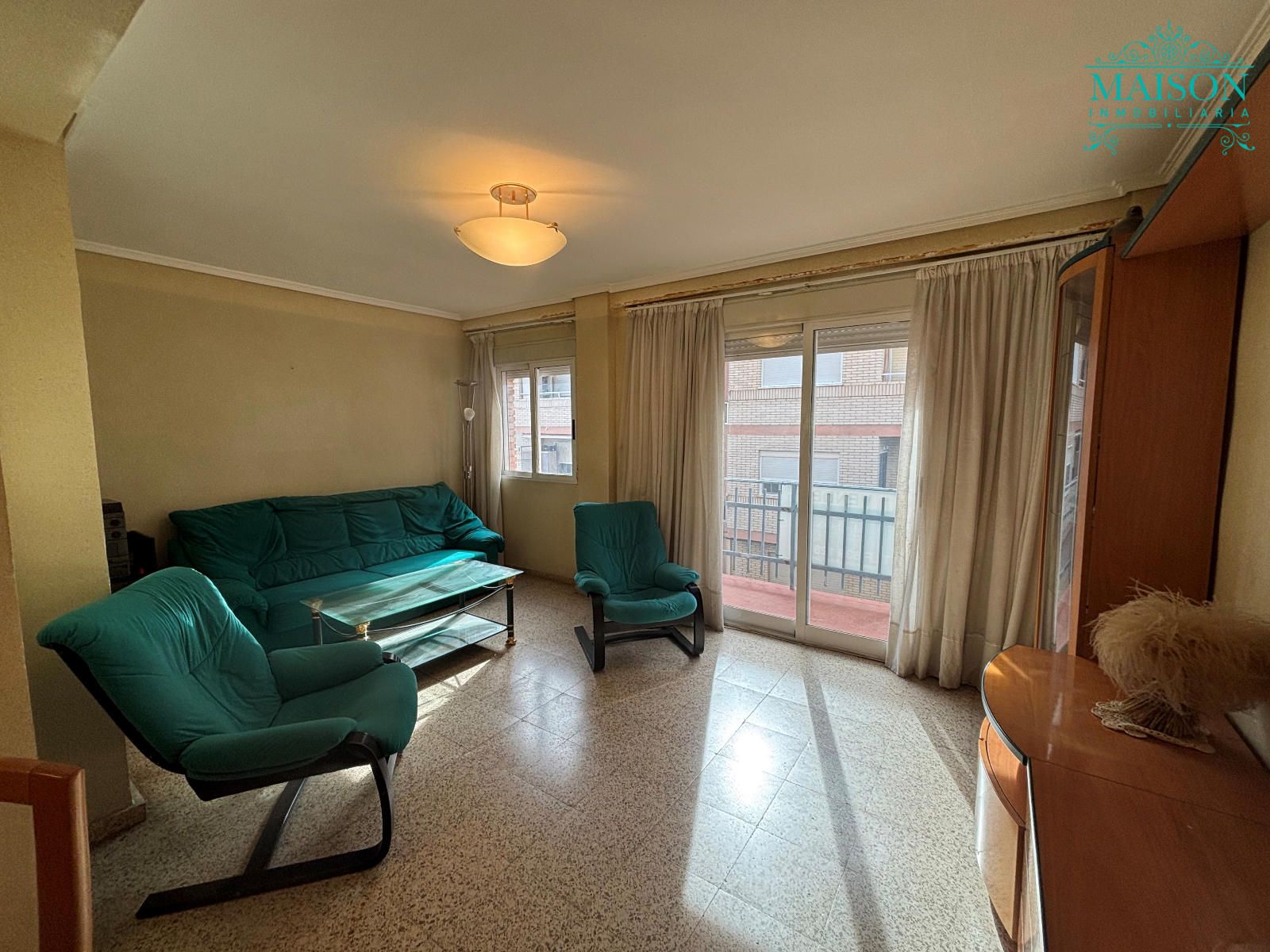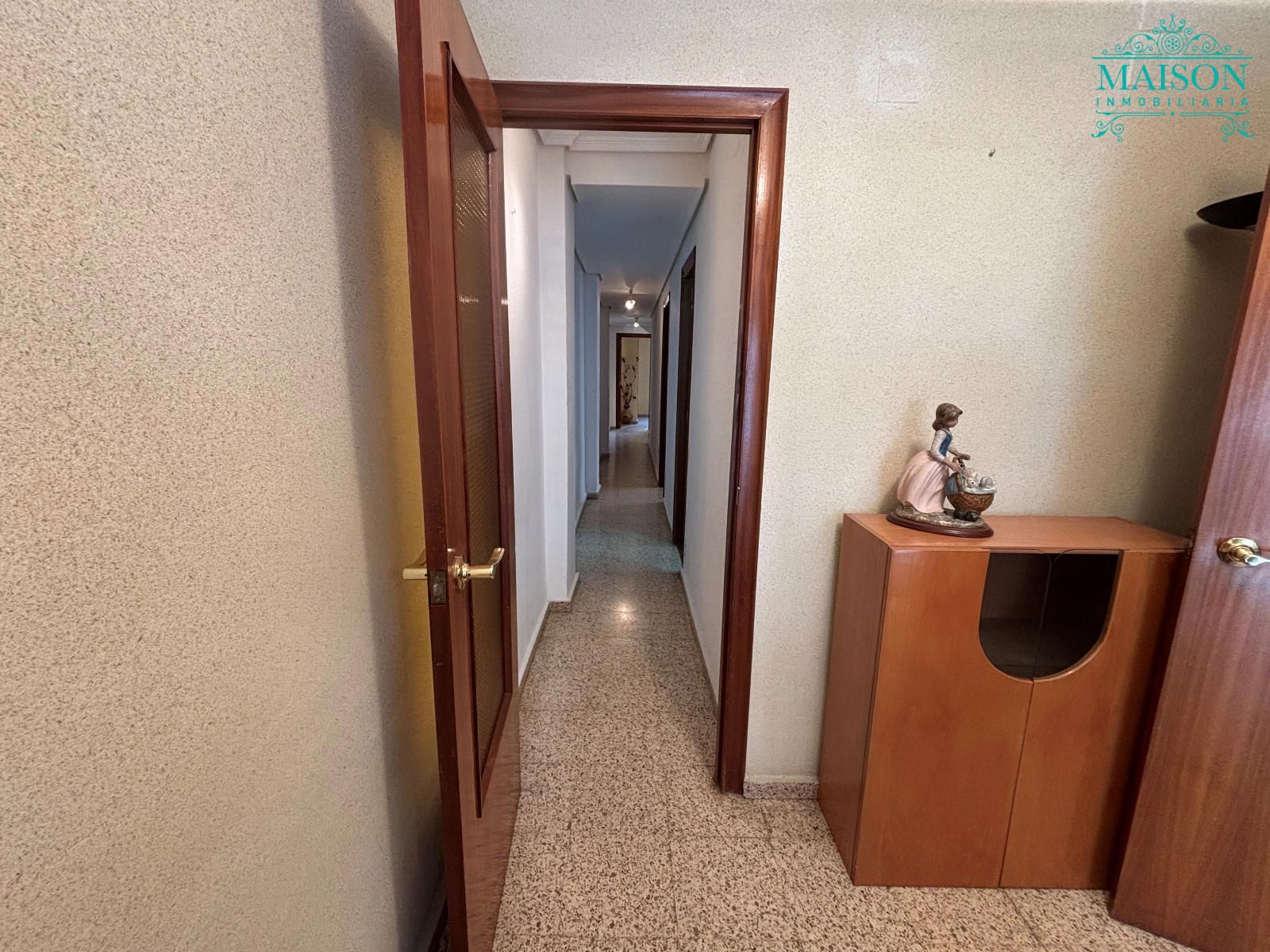 Este piso 2º tiene armarios empotrados, techos altos, puertas de madera, ventanas de aluminio climalit blanco, excepto en los dormitorios individuales donde son de hierro, suelos de terrazo, agua caliente a través de gas butano, pintura gotelé, etc….