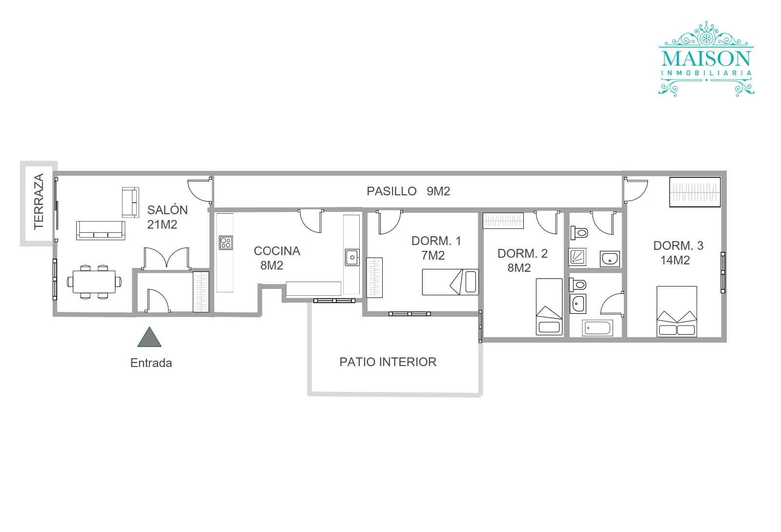 En la única planta principal encontramos el salón con salida a una terraza exterior, la cocina, tres dormitorios y un baño. Además, el dormitorio principal cuenta con baño en suite.